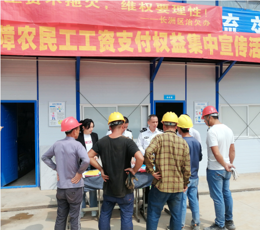 在梧州市部分建设工程项目现场,市劳动保障监察支队与长洲区劳动保障监察大队联合开展了普法宣传活动,将《保障农民工工资支付条例》宣传工作手册等宣传资料送入企业、工地,累计发放宣传资料300多份。活动中,工作人员耐心解答用人单位和农民工提出的关于欠薪和劳动合同等问题,引导农民工合理维护自身权益,并以座谈会形式,与项目负责人进行谈话交流,详细解读《条例》内容,要求项目相关单位要切实落实“一金七制度”,规范用工行为,提高依法支付农民工工资的自觉性。