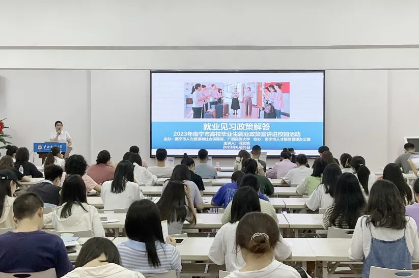 6月26日,为促进高校毕业生更加充分更高质量就业,抢抓高校毕业生就业工作关键期、冲刺期,进一步加大南宁市促进高校毕业生就业创业政策宣传力度,南宁市人力资源和社会保障局联合广西民族大学开展2023年南宁市高校毕业生就业政策宣讲活动,广西民族大学共75名毕业生参加此次活动。