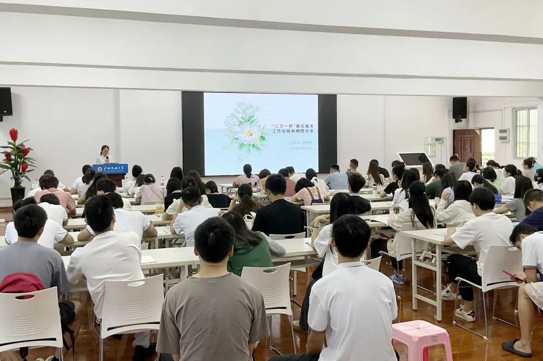 活动中,市人社部门工作人员以南宁市大力支持高校毕业生来邕留邕就业创业系列政策为切入点,重点讲解“三支一扶”计划、乡村振兴村级协理员等基层就业政策,着重介绍“三支一扶”政策招募对象、政策保障、福利待遇等。同时邀请两名“三支一扶”在岗人员现场分享“三支一扶”工作中的经验与感悟,激励毕业生投身乡村振兴事业,引导高校毕业生基层就业。活动还设置现场问答环节,现场解答同学们提出的问题。参加宣讲活动的同学纷纷表示,通过此次宣讲会,对基层就业政策有更充分的了解,对实现自我价值、提升就业竞争力有更深的体会。