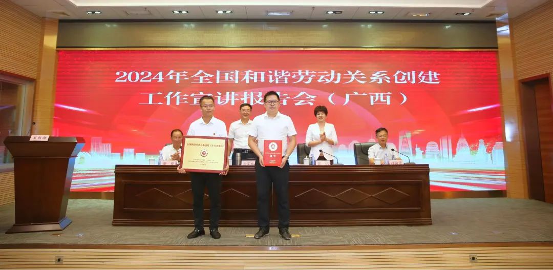 会上,自治区相关部门领导为广西受表彰的全国和谐劳动关系建工作集体和先个人颁发牌匾、证书、章。自治区人力源社会保障厅劳动关系、防城港市港口区沙潭江街道第一届全国和谐劳动关系建工作先集体,柳州市工会韦红革等8人荣第一届全国和谐劳动关系建工作先个人,6名先个人代表作事迹宣。