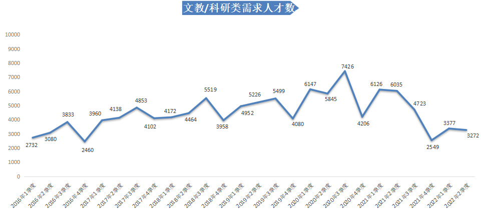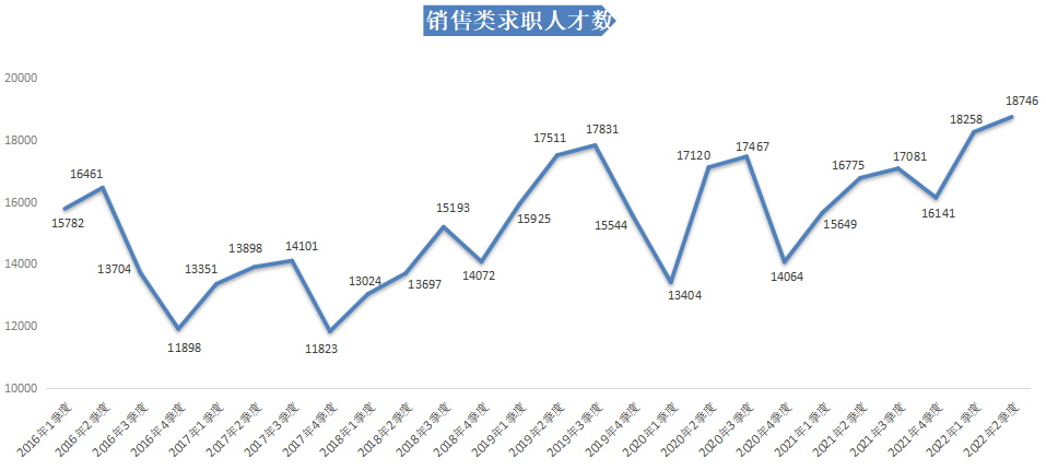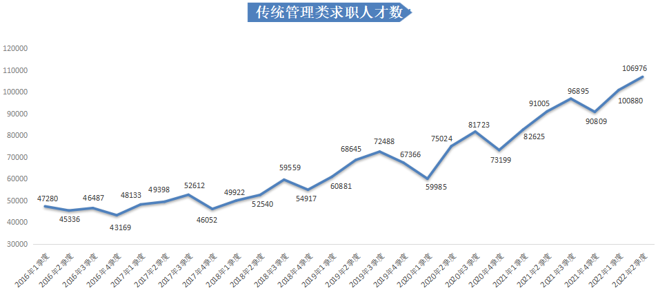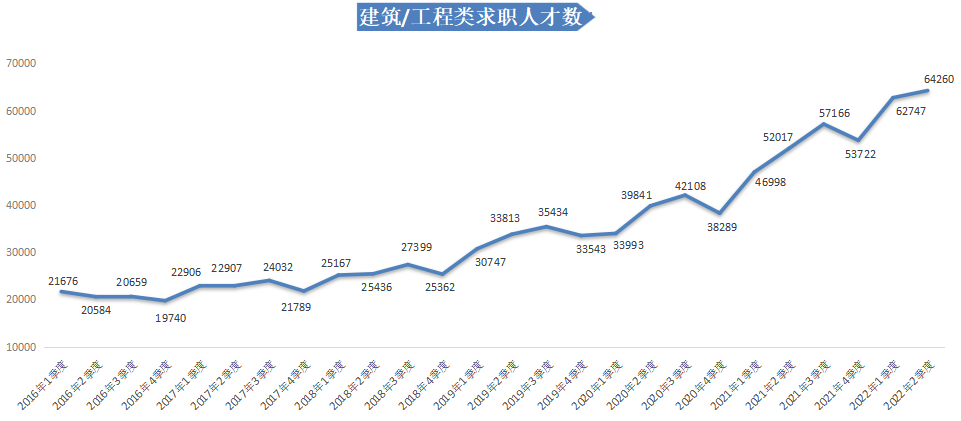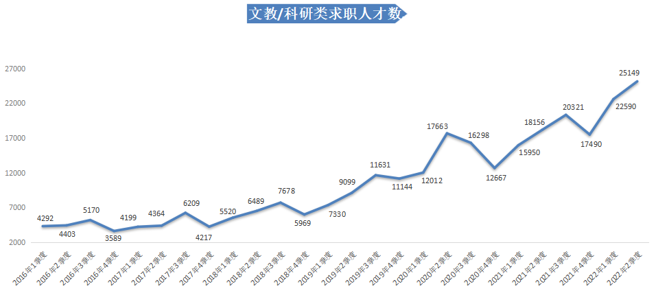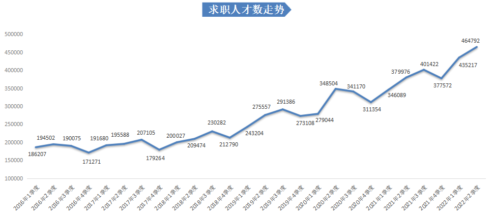 2022年第二季度,广西人才网中求职人才数量持续高涨,达到464792人,与上年同期相比增长22.32%,与上季度相比增长6.80%。