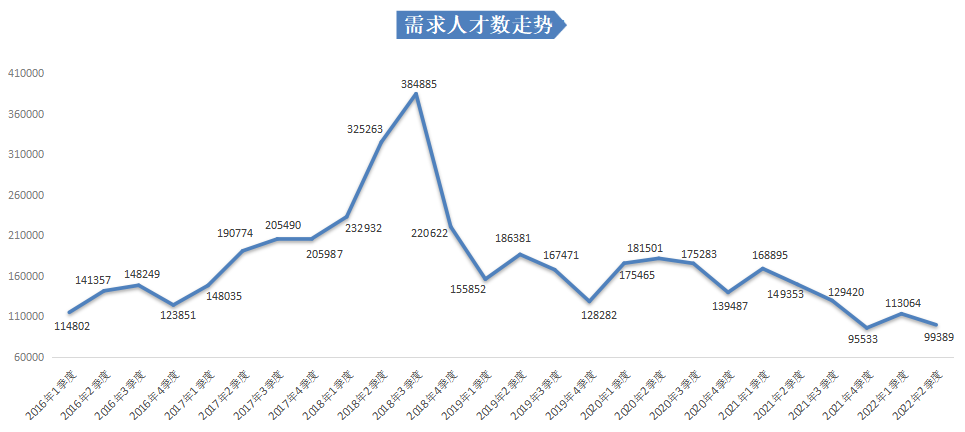 在人才需求方面,有招聘需求的用人单位需求人才数为99389人,同比下滑33.45%,环比下滑12.09%。