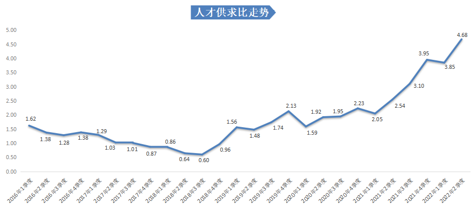 近四年,由于人才供给快速增长,而人才需求数量持续走低,广西人才网中人才供求比持续攀高,均超过1个人竞争一个岗位。2022年第二季度广西人才网人才供求比达到4.68,同比增加2.13,环比增加0.83。