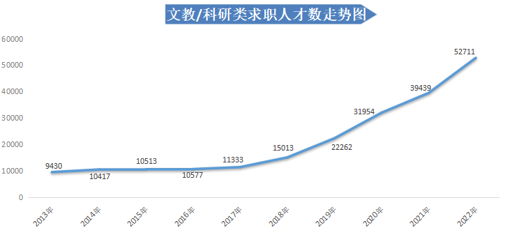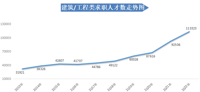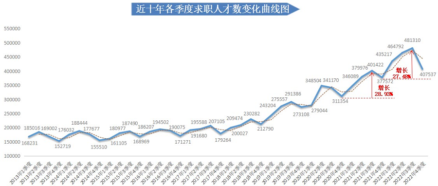 从人才供应量走势看,近年来广西人才网中人才供应量呈快速增长态势。2022年求职人才数为883832人,与上年度相比增长22.38%,其中2022年第三季度的求职人才数再创新高,达到近十年季度求职人才数的峰值,为481310人,与2021年第四季度相比大幅增长27.48%。