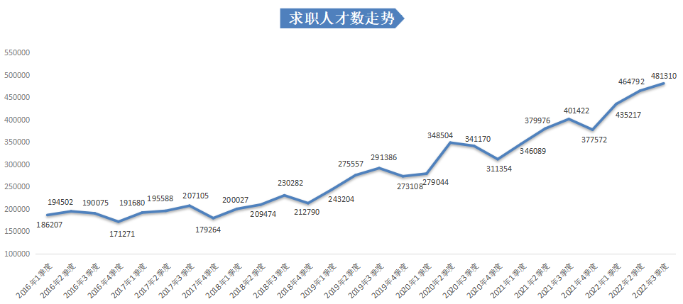 2022年第三季度,广西人才网中求职人才数量持续增长,达到481310人,与上年同期相比增长19.90%,与上季度相比增长3.55%。