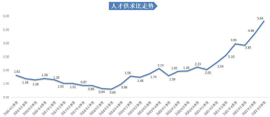 近两年,由于人才供给快速增长,而人才需求数量减少明显,广西人才网中人才供求比处于较高水平,均超过2个人竞争一个岗位。2022年第三季度广西人才网人才供求比达到5.64,同比增加2.54,环比增加0.96。
