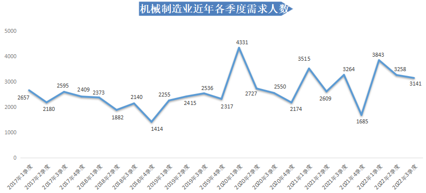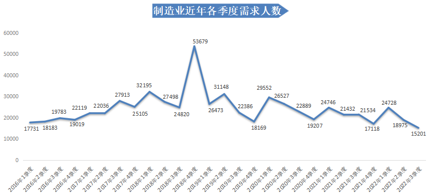 2022年第三季度,制造业需求人才数为15201人,比上年同期的21534人减少6333人,同比下滑29.41%,环比下滑19.89%。