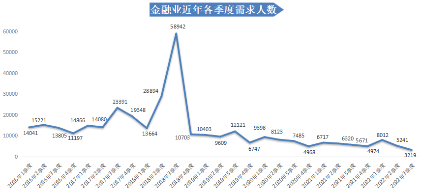 2022年第三季度,广西人才网中金融业人才需求量下降明显,需求人才数为3219人,比上年同期的5671人减少2452人,同比下滑43.24%,环比下滑38.58%。其中,保险业以及除银行和证券之外的其他金融行业人才需求的大幅减少是导致金融业人才需求下滑的主要原因,合计减少1682人,同比下滑38.27%,环比下滑22.20%。