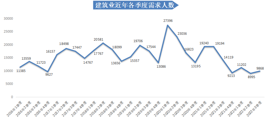 2022年第三季度,广西人才网中建筑业的人才需求量有所回升,其需求人才数为9868人,虽与上年同期的14119人相比减少了4251人,同比下滑30.11%,但与上季度相比仍增长9.71%。在该行业下,房屋和土木工程建筑、建筑安装等行业人才需求环比实现增长,需求人才数分别为4591人和1166人,虽同比减少1197人和823人,下滑20.68%和41.38%,但仍比上季度增长26.79%和12.98%。