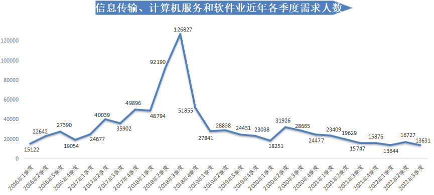 2022年第三季度,广西人才网中信息传输、计算机服务和软件业人才需求较低迷,需求人才数为13631人,比上年同期的15747人减少2116人,同比下滑13.44%,环比下滑18.51%。