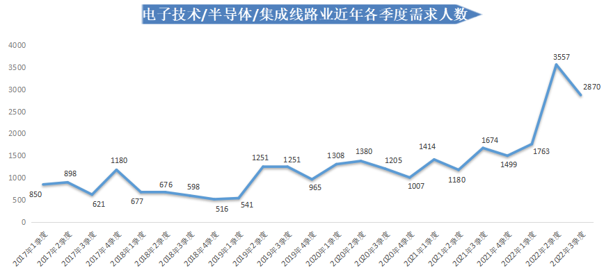 在总体人才需求大幅下滑的局势下,信息传输/计算机服务和软件业下的电子技术/半导体/集成线路行业则释放出较多的岗位需求,需求人才数为2870人,虽季节性回落19.31%,但仍比上年同期增加1196人,同比涨幅为71.45%。