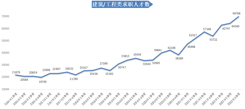 2022年第三季度,广西人才网中建筑/工程类职位的求职人才数持续攀升,达到69768人,与上年同期的57166人相比增加12602人,同比增长22.04%,是本季度人才供应量最多且同比增长量最大的职位类型。