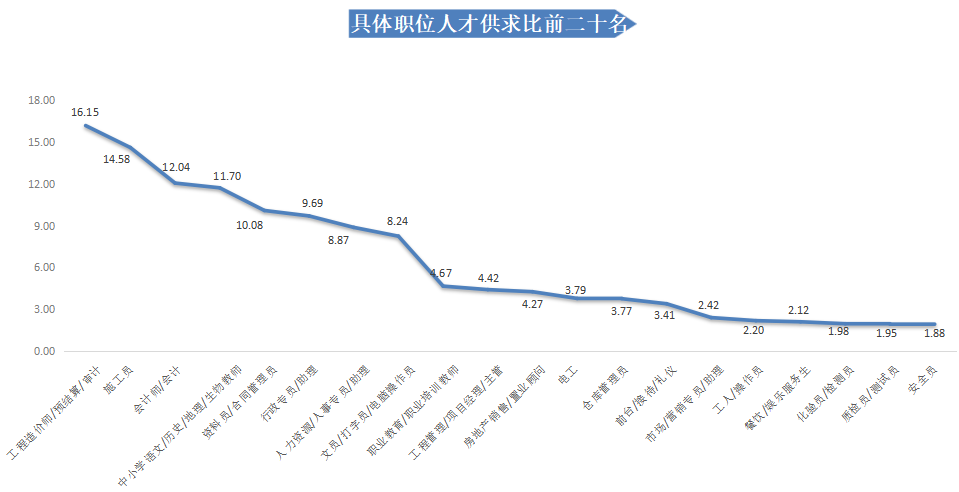 从具体职位看,在人才需求量具有一定规模的职位人才竞争激烈程度的前二十名具体职位中,最高供求比高达16.15,超过16人竞争1个岗位,第二十名的职位也超过1个人竞争1个岗位。
