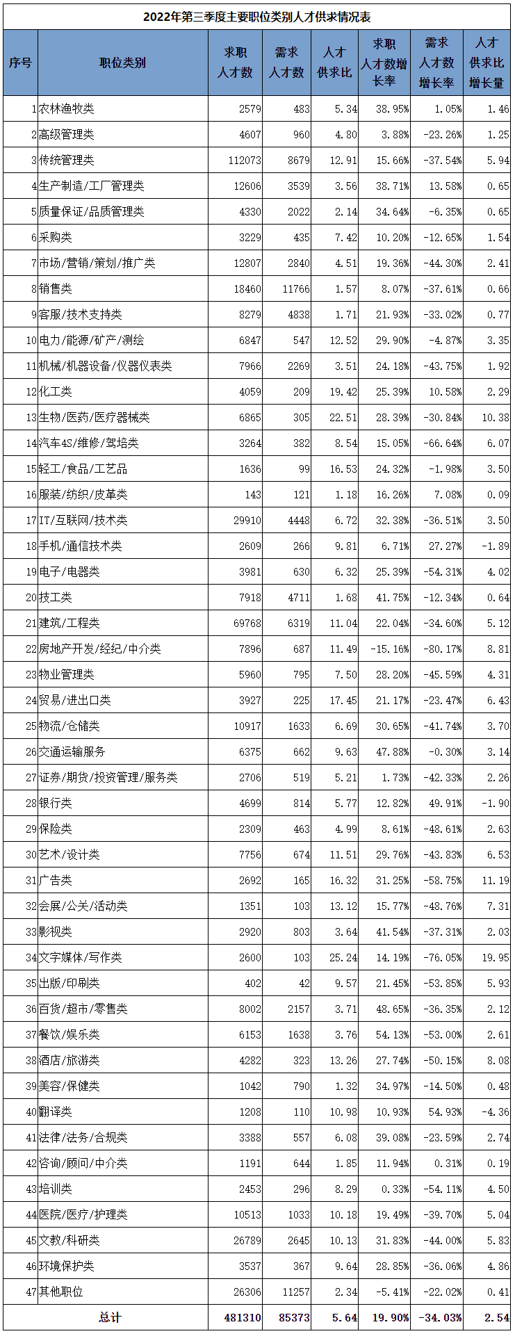 2022年第三季度广西人才网总人才供求比为5.64,同比增加2.54,环比增加0.96。同时,各种类别的职位竞争程度差异有拉大趋势,结构性矛盾较为明显。