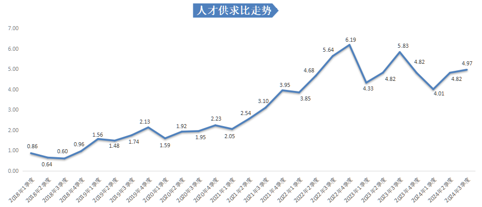 2024年第三季度,广西人才网中人才供求比为4.97,即超过4个人竞争1个岗位。这一比例与去年同期相比减少0.86,与上季度相比增加0.15,依旧处于相对较高的水平。