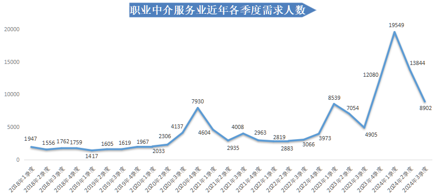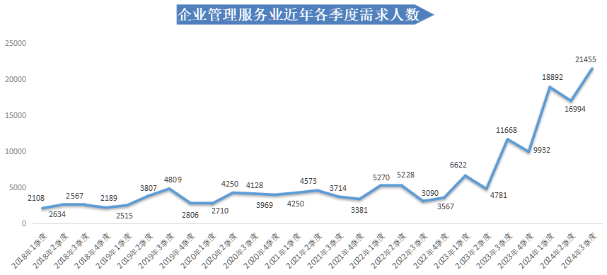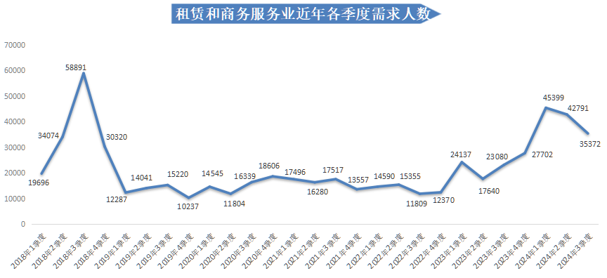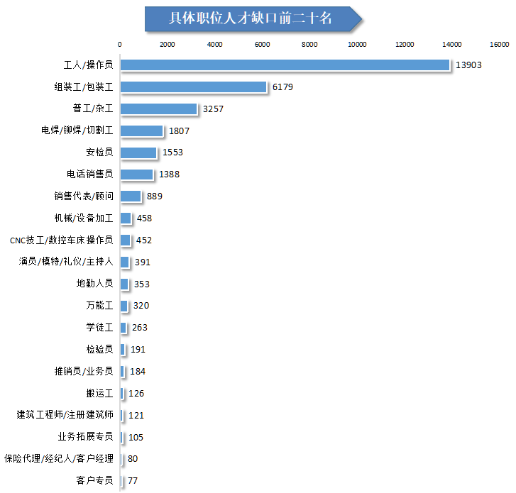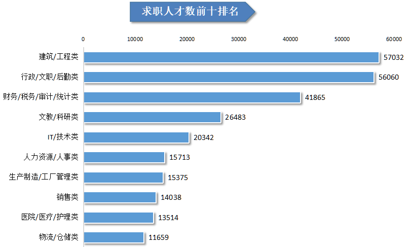 在24个主要行业类别中,有10个行业类别的人才需求相较于上年同期实现不同程度的增长。租赁与商务服务业尤为亮眼,需求人才数比上年同期增加12292人,同比增长53.26%,是本季度人才需求量同比增长最多的行业类别;其次是信息传输、计算机服务和软件业,需求人才数比上年同期增加6028人,同比增长76.53%;同比增长量排名第三的是建筑业,需求人才数比上年同期增加1212人,同比增长22.19%。