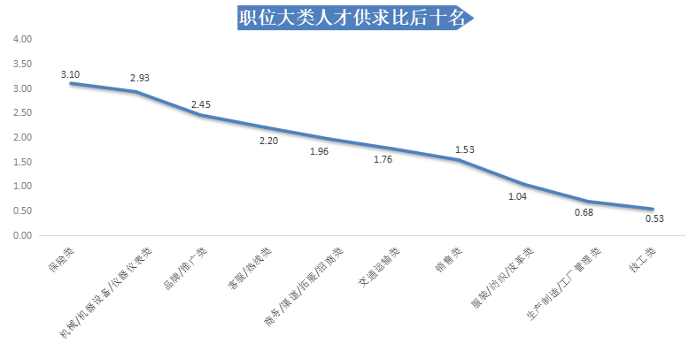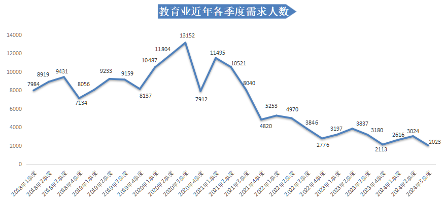 另外,有14个行业类别的人才需求相较于上年同期出现不同程度的下滑。教育业人才需求量减少明显,需求人才数比上年同期减少1157人,同比下滑36.38%。