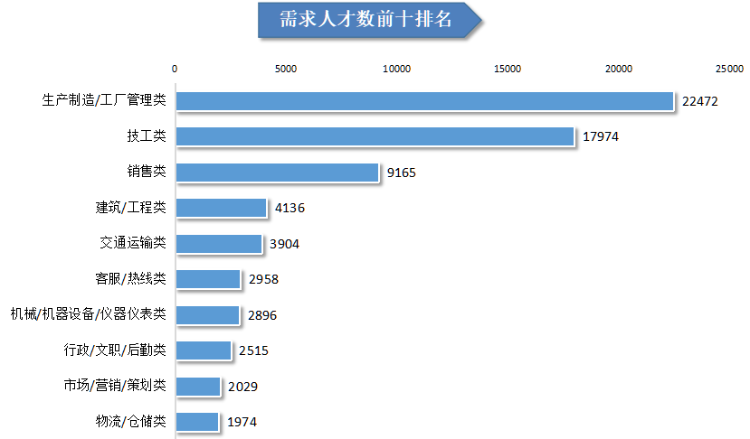 在行业分布中,人才需求量排名前五的行业类别分别为:租赁和商务服务业、制造业、信息传输/计算机服务和软件业、建筑业、房地产业,这五个行业合计需求人才数占比达到80.44%。