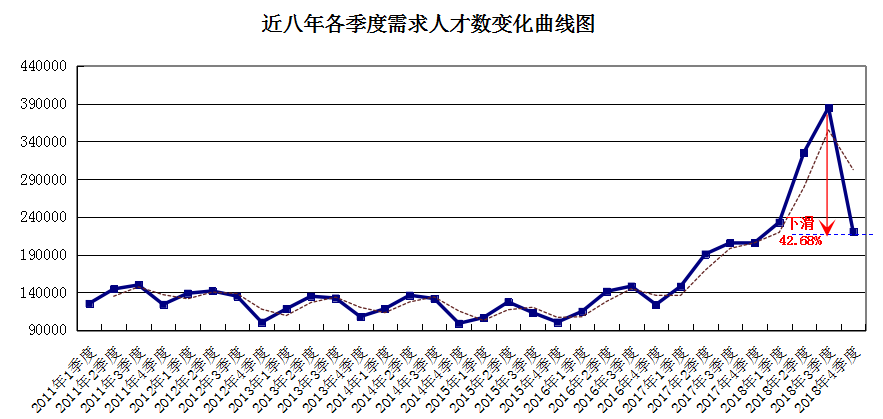 2018年广西人才网联系统中用人单位对人才的需求与上年度相比涨幅较大,其人才需求量为1066395人,与上年度相比增加了303726人,大幅增长39.82%。其中,其中第三季度需求人才量达到近八年的季度最高值,而第四季度需求人才量则比第三季度大幅下滑42.68%。