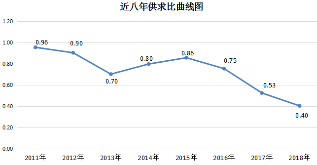 广西人才网联系统的数据显示,2018年广西人才网联系统中用人单位数量为22060家,比上年度增长9.90%,需求人才数为1066395人,比上年度大幅增长39.82%,而求职人才数为430239人,与上年度相比小幅增长7.40%,总人才供求比为0.40(即人才需求人数或职位数为1时,人才供给或求职人才数为0.40,下同)。