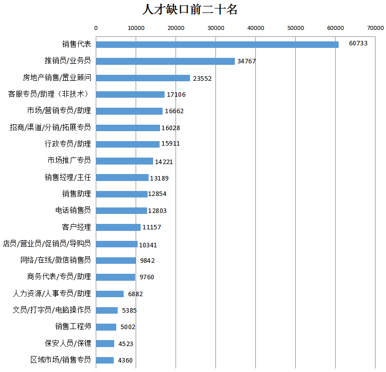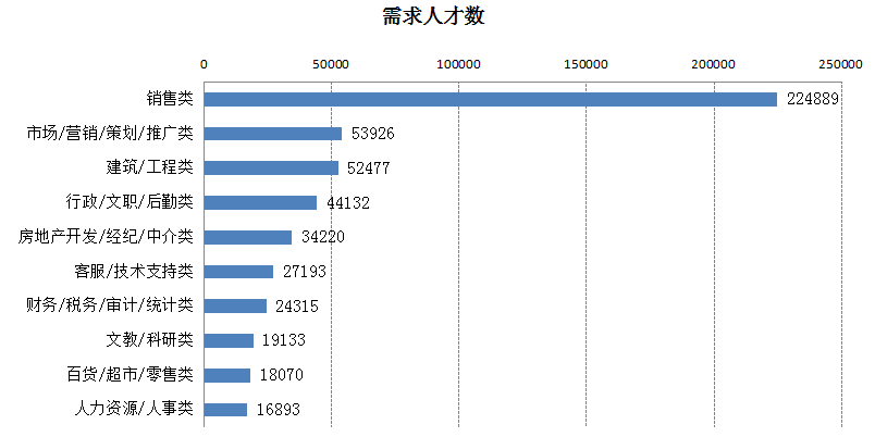 2018年广西人才网联系统人才供求比为0.40,总人才缺口达到636156人。在54个主要职位类别中,人才缺口主要集中在业务类、服务类和房地产类职位中。人才缺口前十位的职位类别如下:销售类职位人才缺口为195237人;市场/营销/策划/推广类职位人才缺口为40851人;房地产开发/经纪/中介类职位人才缺口为23012人;客服/技术支持类职位人才缺口为19482人;百货/超市/零售类职位人才缺口为14303人;技工类职位人才缺口为7093人;餐饮/娱乐类职位人才缺口为5438人;文教/科研类职位人才缺口为4120人;美容/保健类职位人才缺口为3582人以及建筑/工程类职位人才缺口为3355人。这十个职位类别合计人才缺口达到316473人,合计人才供求比仅为0.31。