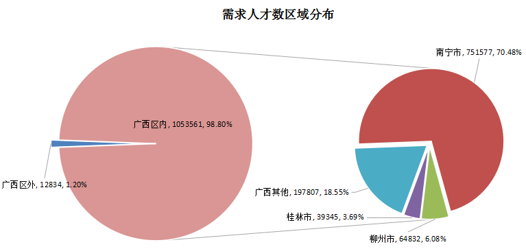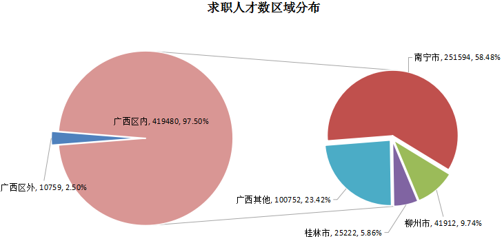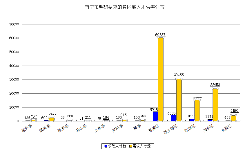 其中期望在南宁市工作的求职人才数达到251594人,占比58.48%,而工作地在南宁市的需求人才数达到751577人,占比70.48%。对南宁市具体工作区域没有明确要求的求职人才有235942人,占比54.84%,而有明确要求的区域中,南宁市青秀区和西乡塘区是比较热门的求职地点,求职人才数分别有6918人和4335人,明确工作地在这两个区的用人单位需求人才数分别达到60337人和30466人。