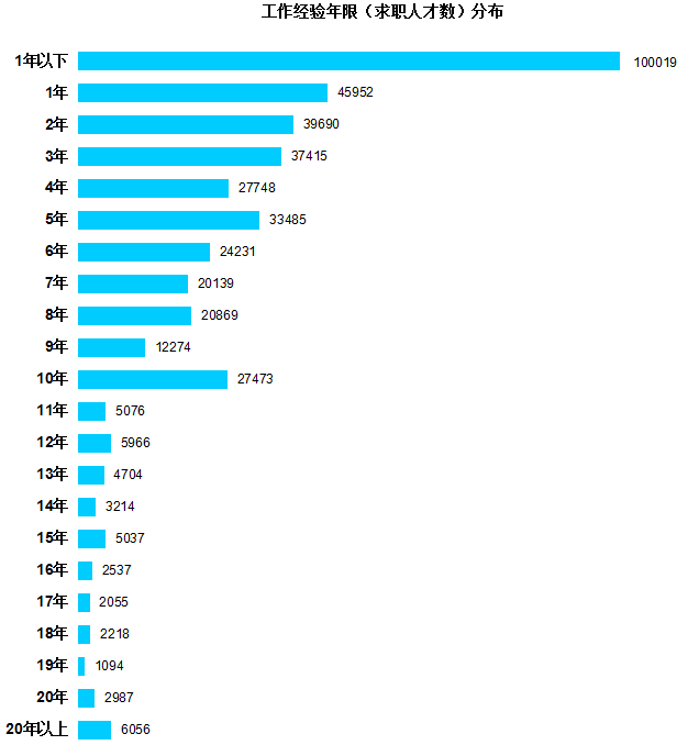 2018年广西人才网联系统中,1年以下工作经验的求职人才有100019人,占比23.25%,1-5年工作经验的求职人才共有184290人,占比达到42.83%,6-10年工作经验的求职人才共有104986人,占比为24.40%,10年以上工作经验的求职人才有40944人,占比为9.52%。
