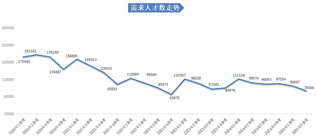 广西人才网供求数据显示,2025年第二季度需求人才数为76566人,同比下滑23.11%;求职人才数为464545人,同比下滑3.18%;总人才供求比为6.07(即人才需求人数或职位数为1时,人才供给或求职人才数为6.07,下同),比上年同期的4.82增加1.25。