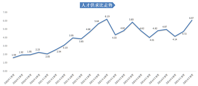 2025年第二季度,广西人才网中人才供求比为6.07,即超过6个人竞争1个岗位,与去年同期相比增加1.25,与上季度相比增加1.35,就业压力较大。