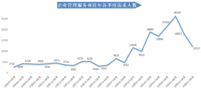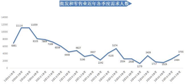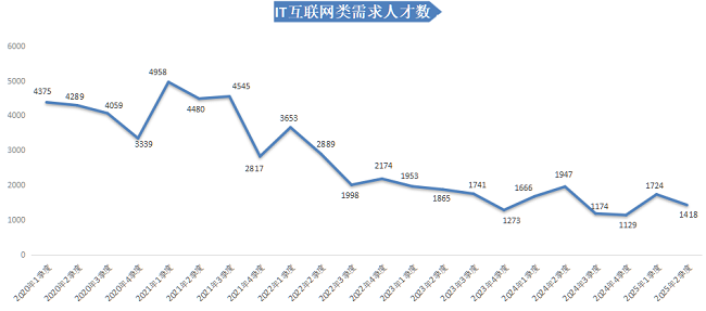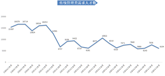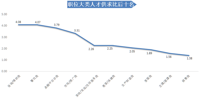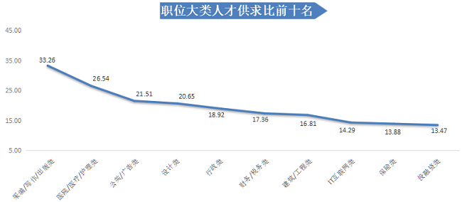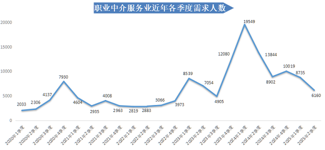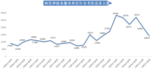 在24个主要行业类别中,有超过六成行业类别的人才需求相较于上年同期出现不同程度的下滑。其中,需求减少主要集中在租赁与商务服务业中,需求人才数为22819人,比上年同期减少19972人,同比下滑46.67%,是本季度人才需求量同比减少最多的行业类别。