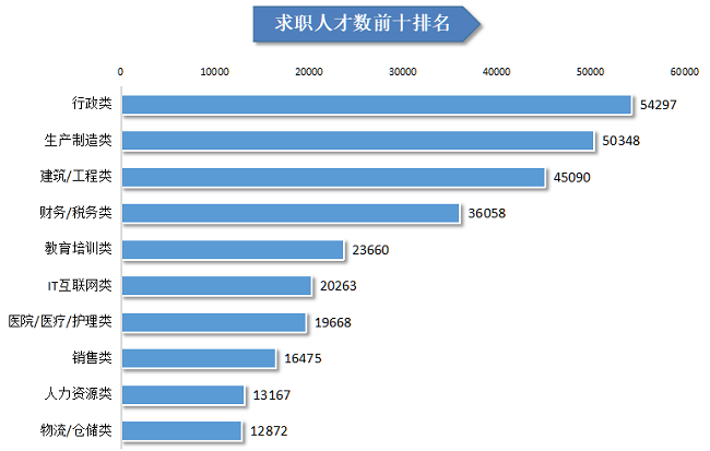 在行业分布中,人才需求量排名前五的行业类别分别为:租赁和商务服务业、制造业、信息传输/计算机服务和软件业、建筑业、批发和零售业,这五个行业合计需求人才数占比达到71.98%。