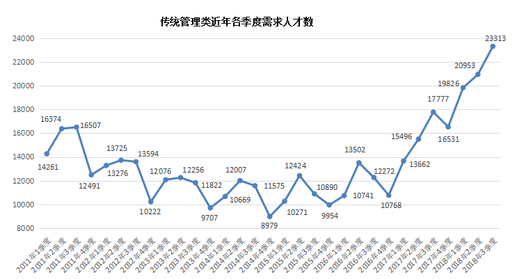 5. 三大传统管理类职位(包含行政/文职/后勤类、人力资源/人事类及财务/税务/审计/统计类等职位类别,下同)的人才需求同比大幅增长,创历史新高,其人才需求总量为23313人,与上年同期相比增加5536人,同比涨幅达到31.14%。