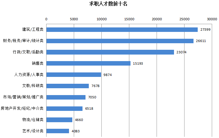 1. 位居求职榜前十名的职位:建筑/工程类、财务/税务/审计/统计类、行政/文职/后勤类、销售类、人力资源/人事类、文教/科研类、市场/营销/策划/推广类、房地产开发/经纪/中介类、物流/仓储类及艺术/设计类等职位类型。这十个职位类型的求职人才数量总计132140人,合计占比达到57.38%。其中,建筑/工程类、财务/税务/审计/统计类及行政/文职/后勤类这三类职位类型的求职人才数稳居前三位,均超过20000人。另外,艺术/设计类职位的求职人才数首次跻身求职人数前十名的榜单。