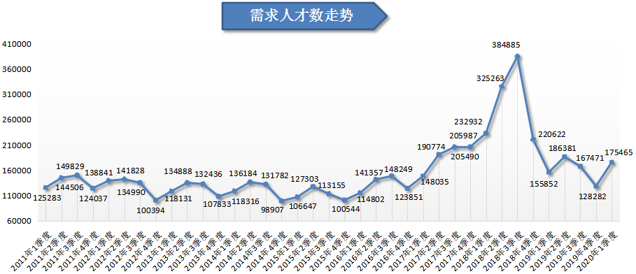 在人才供给方面,求职人才数保持稳定增长态势,在2020年第一季度达到279044人,比上年同期增加35840人,同比增长14.74%。