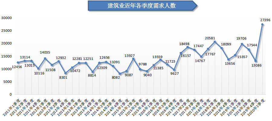 1.建筑业的需求人才数同比增长明显,为27396人,比上年同期的15357人增加12039人,同比大幅增长78.39%,是本季度人才需求同比增长最大的行业。其中建筑安装行业是建筑业人才需求的主要增长点,其需求人才数为15286人,比上年同期增加13567人,同比涨幅达88.75%。