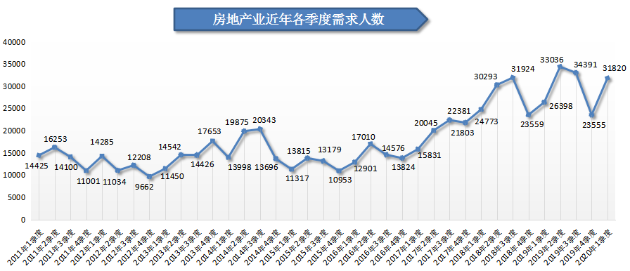2.房地产业需求人才数为31820人,比上年同期的26398人增加5422人,同比大幅增长20.54%。其中,房地产中介服务行业人才需求增长较大,其需求人才数为10760人,比上年同期的7304人增加3456人,同比大幅增长47.32%。