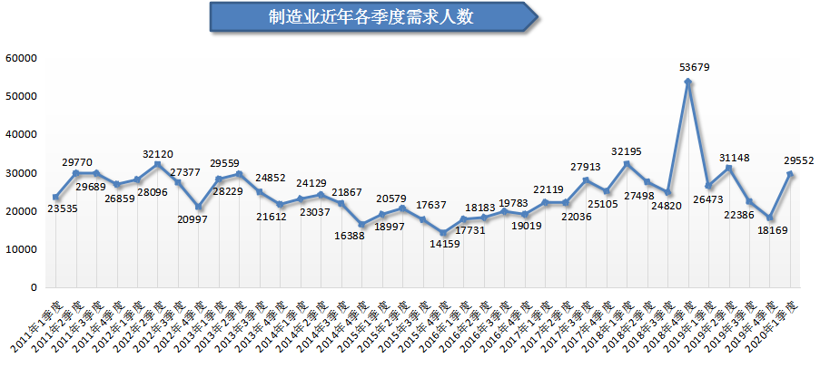 3.制造业需求人才数为29552人,与上年同期相比增加了3079人,同比增长11.63%。