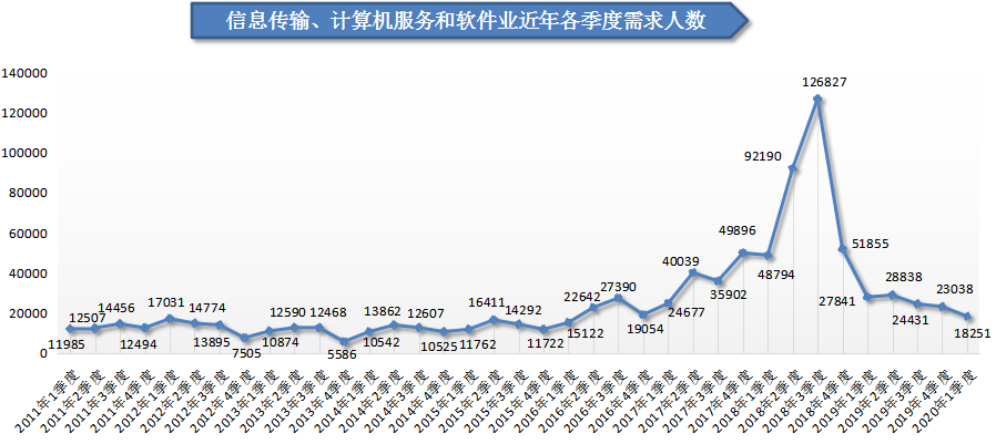 5.信息传输/计算机服务和软件业人才需求持续低迷,其需求人才数为18251人,与上年同期的27841人相比,减少了9590人,同比大幅下滑34.45%,其中,互联网和电子商务行业人才需求下滑较大,这两个行业的需求人才数分别为4436人和2917人,比上年同期分别减少8387人和3304人,同比降幅分别达到65.41%和53.11%。