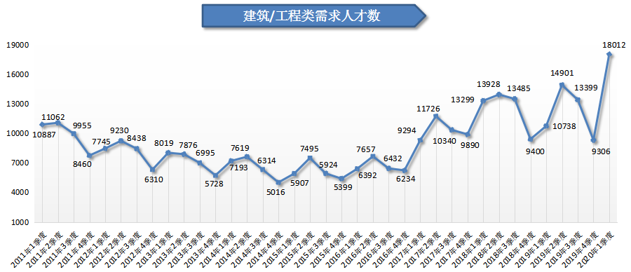 2020年第一季度,建筑/工程类职位需求人才数为18012人,比上年同期的10738人增加7274人,同比大幅增长67.74%,环比大幅增长93.55%。建筑/工程类职位中有超过八成的职位人才需求呈现增长态势,其中同比增长量排名前三的有施工员、工程管理/项目经理/主管以及建筑工程师/注册建筑师等职位,同比增长量分别为1086人、866人以及811人,同比涨幅分别达到81.04%、82.55%以及102.01%。