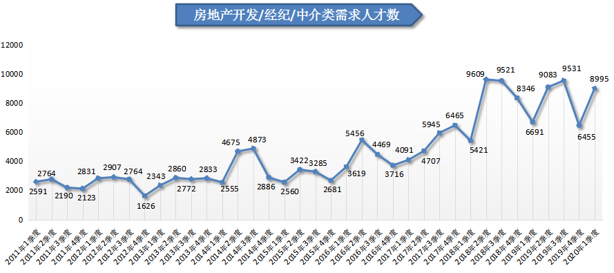 2.房地产开发/经纪/中介类职位需求人才数为8995人,与上年同期的6691人相比增加2304人,同比大幅增长34.43%。