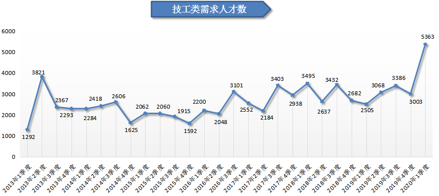 4.技工类职位人才需求同比大幅增长,创历史新高,其需求人才数为5363人,比上年同期增加2858人,同比大幅增长114.09%,环比大幅增长78.59%。