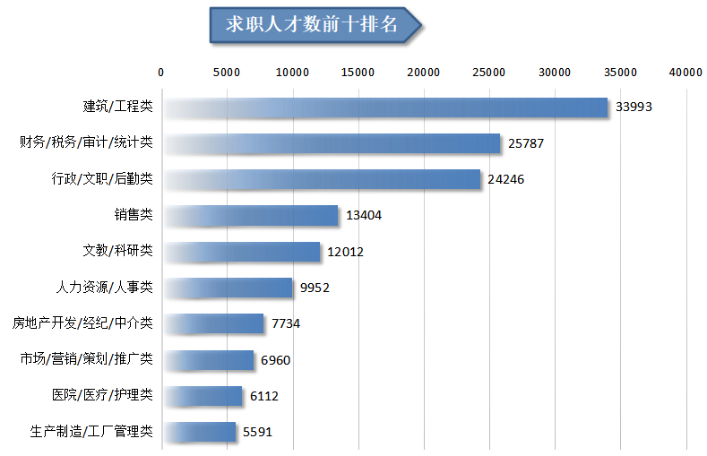位居求职榜前十名的职位:建筑/工程类、财务/税务/审计/统计类、行政/文职/后勤类、销售类、文教/科研类、人力资源/人事类、房地产开发/经纪/中介类、市场/营销/策划/推广类、医院/医疗/护理类、生产制造/工厂管理类等职位类型。这十个职位类型的求职人才数量总计145791人,合计占比达到52.25%。其中,建筑/工程类、财务/税务/审计/统计类及行政/文职/后勤类这三类职位类型的求职人才数稳居前三位,均超过20000人。