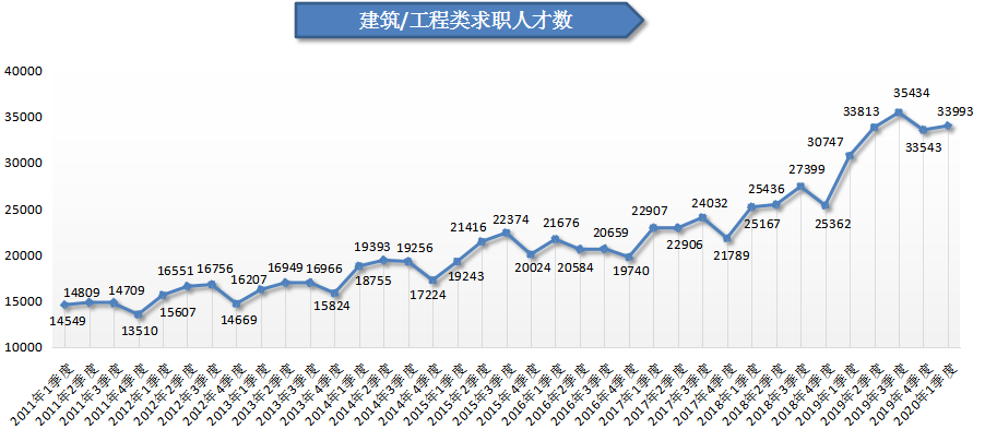 2020年第一季度,广西人才网中建筑/工程类职位的求职人才数为33993人,与去年同期的30747人相比增加3246人,同比增长10.56%。
