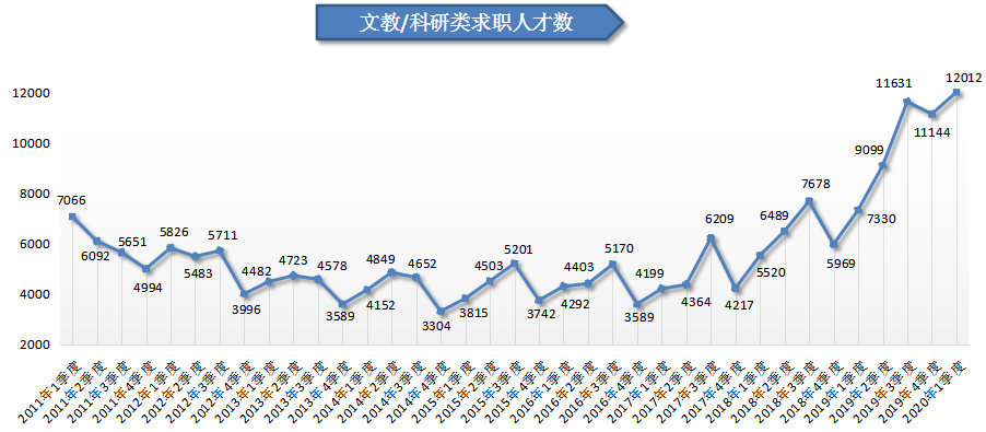 2020年第一季度,广西人才网中文教/科研类职位的人才供应量持续攀高,同比大幅增长,其求职人才数为12012人,比上年同期增加4682人,同比涨幅达到63.87%。