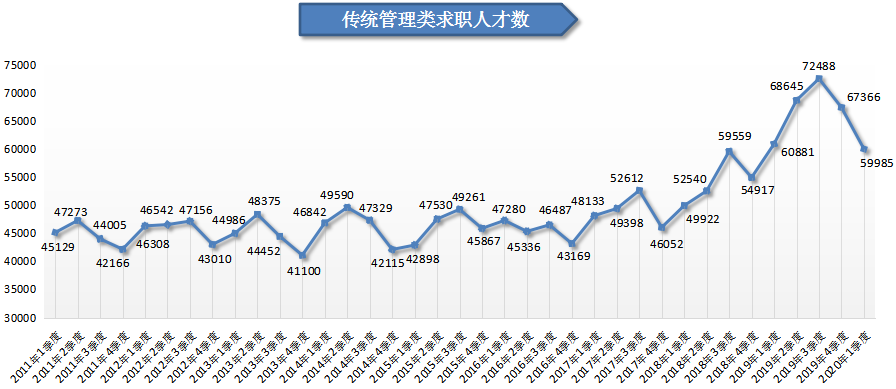 2020年第一季度,广西人才网中传统管理类职位(包含行政/文职/后勤类、人力资源/人事类及财务/税务/审计/统计类等职位类别,下同)的人才供应总量虽有所减少,但仍维持较高水平,其求职人才数为59985人,仅比上年同期减少896人,同比小幅下滑1.47%。其中行政/文职/后勤类职位与上年同期相比增加了932人,同比小幅增长4.00%。