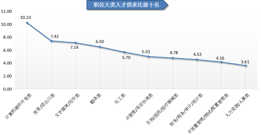 54个主要职位类型中,人才供求比大于2的职位类型有27个,其中18个类型的职位竞争激烈,人才供求比大于等于3。其中计算机硬件开发类、贸易/进出口类和文字媒体/写作类职位由于需求较少,就业竞争压力较大,其供求比分别达到10.23、7.42和7.14。