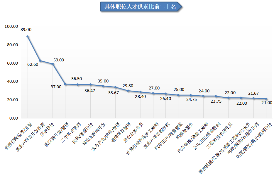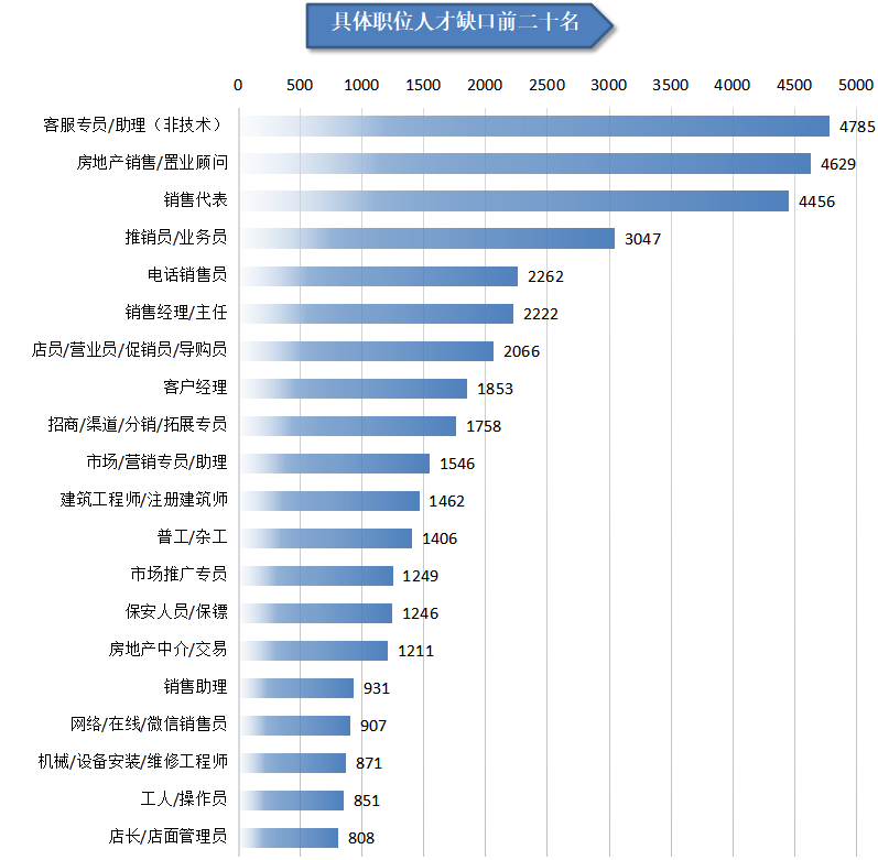 在用人单位最急需人才的前二十名具体职位中,销售类、市场/营销/策划/推广类等业务类人才最为紧缺,有七成职位与其挂钩。其中,客服专员/助理(非技术)、房地产销售/置业顾问及销售代表等职位分列前三名,这三个职位人才供给量较为缺乏,人才缺口(即需求人才数与求职人才数的差额,下同)分别达到4785人、4629人及4456人。