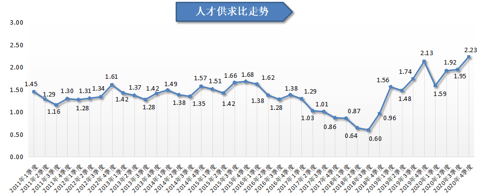2020年第四季度,广西人才网人才供求比为2.23(即人才需求人数或职位数为1时,人才供给或求职人才数为2.23,下同),比上年同期的2.13增加0.10,就业压力稍有增大。