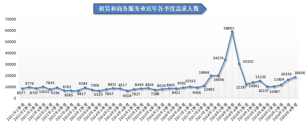 1.租赁和商务服务业人才需求同比增量排名第一,其需求人才数为18606人,与上年同期相比增加了8369人,同比涨幅达到81.75%,环比涨幅为13.87%。其中,职业中介服务行业和企业管理服务行业人才需求增长较大,这两个行业的需求人才数分别为7930人和3969人,比上年同期分别增加5963人和1163人,同比涨幅分别为303.15%和41.45%。