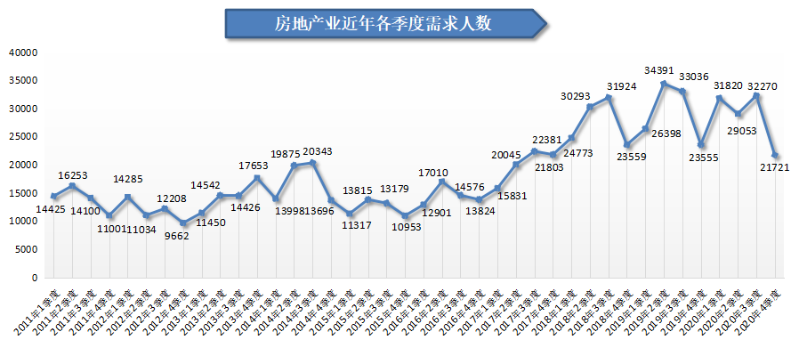 2020年第四季度,广西人才网中房地产业的需求人才数为21721人,比上季度大幅下滑32.69%,比上年同期的23555人减少1834人,同比下滑7.79%。